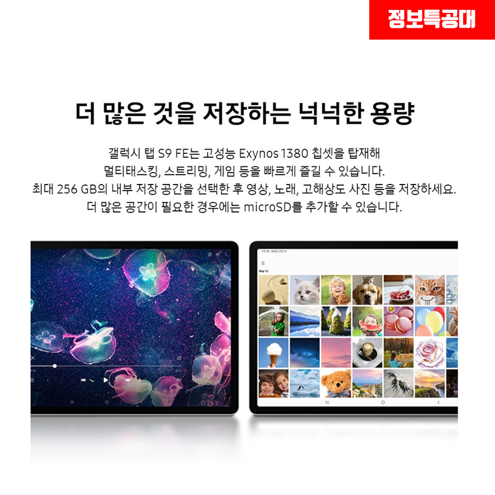 갤럭시탭 S9 FE는 고성능 Exynos 1380 칩셋을 탑재해 멀티태스킹, 스트리밍, 게임 등을 빠르게 즐길 수 있습니다. 최대 256GB의 내부 저장 공간을 선택한 후 영상, 노래, 고해상도 사진 등을 저장하세요. 더 많은 공간이 필요한 경우에는 microSD를 추가할 수 있습니다.