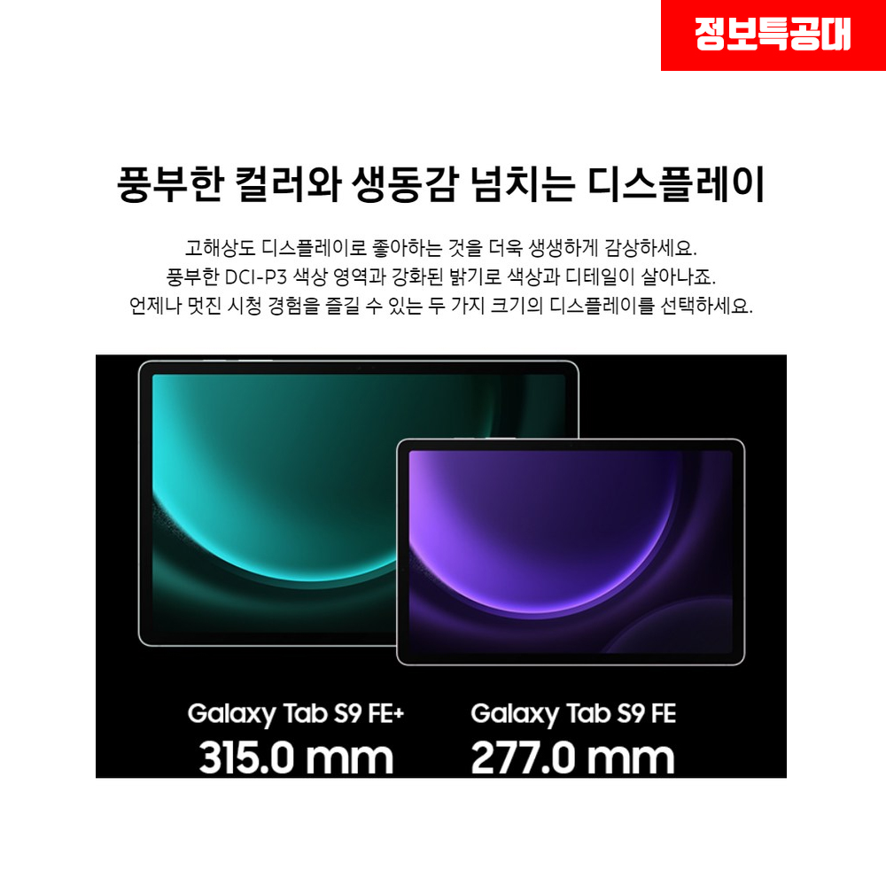 갤럭시탭 S9 FE와 함께 크리에이티브의 가능성과 엔터테인먼트의 즐거움을 느껴보세요. 선명하고 몰입감 넘치는 화면으로 좋아하는 것을 생생하게 보고 만들고 공유할 수 있습니다. 그레이, 민트 또는 라벤더의 다양한 컬러로 나만의 특별한 스타일을 쉽게 연출해 보세요.