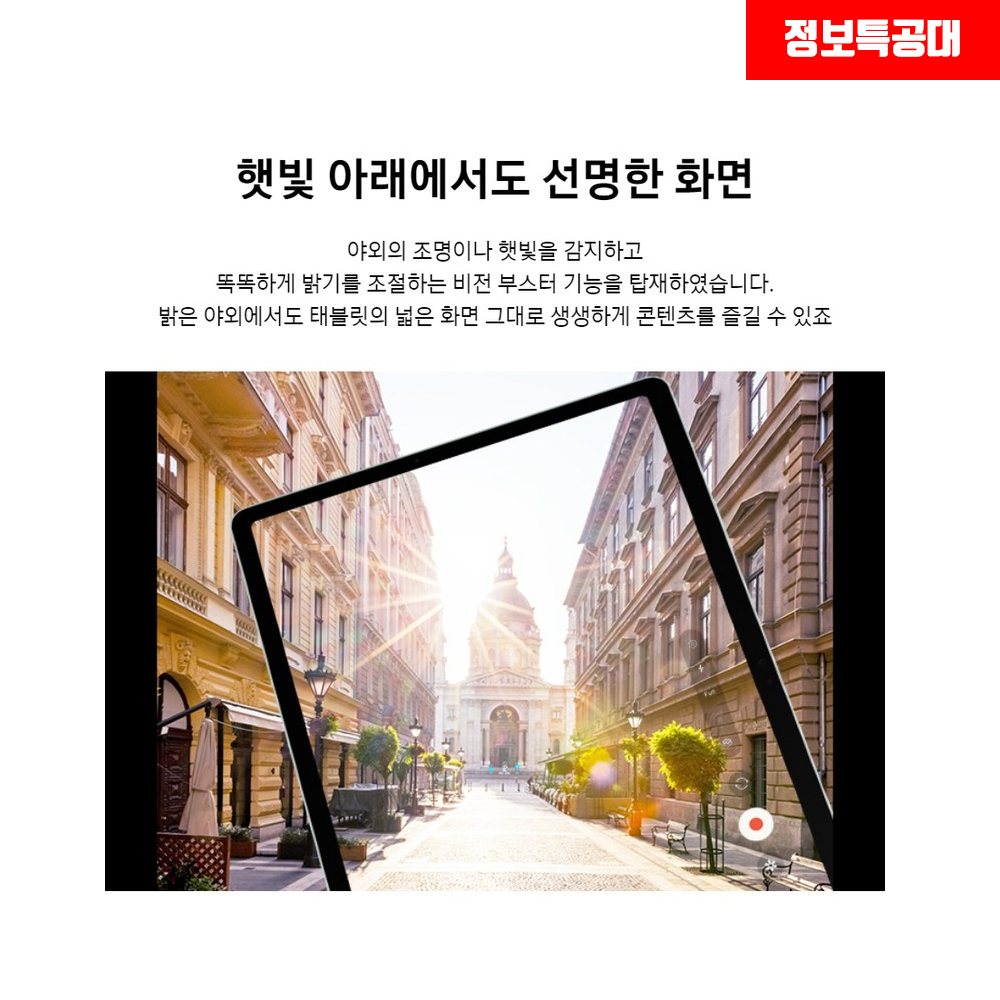 야외의 조명이나 햇빛을 감지하고 똑똑하게 밝기를 조절하는 비전 부스터 기능을 탑재하였습니다. 밝은 야외에서도 태블릿의 넓은 화면 그대로 생생하게 콘텐츠를 즐길 수 있죠.
