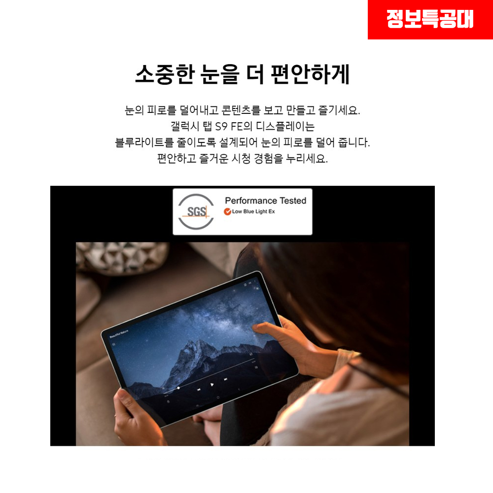 눈의 피로를 덜어내고 콘텐츠를 보고 만들고 즐기세요. 갤럭시탭 S9 FE의 디스플레이는 블루라이트를 줄이고 설계되어 눈의 피로를 덜어줍니다. 편안하고 즐거운 시청 경험을 누리세요.