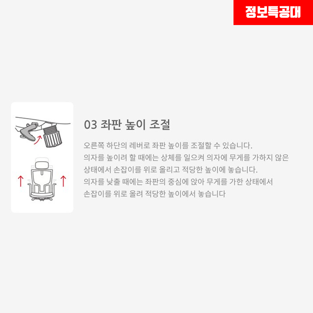 오른쪽 하단의 레버로 좌판 높이를 조절할 수 있습니다. 의자를 높일 때는 상체를 일으켜 무게를 가하지 않은 상태에서, 낮출 때는 좌판 중심에 앉아 무게를 가한 상태에서 손잡이를 위로 올려 적당한 높이에 놓습니다.
