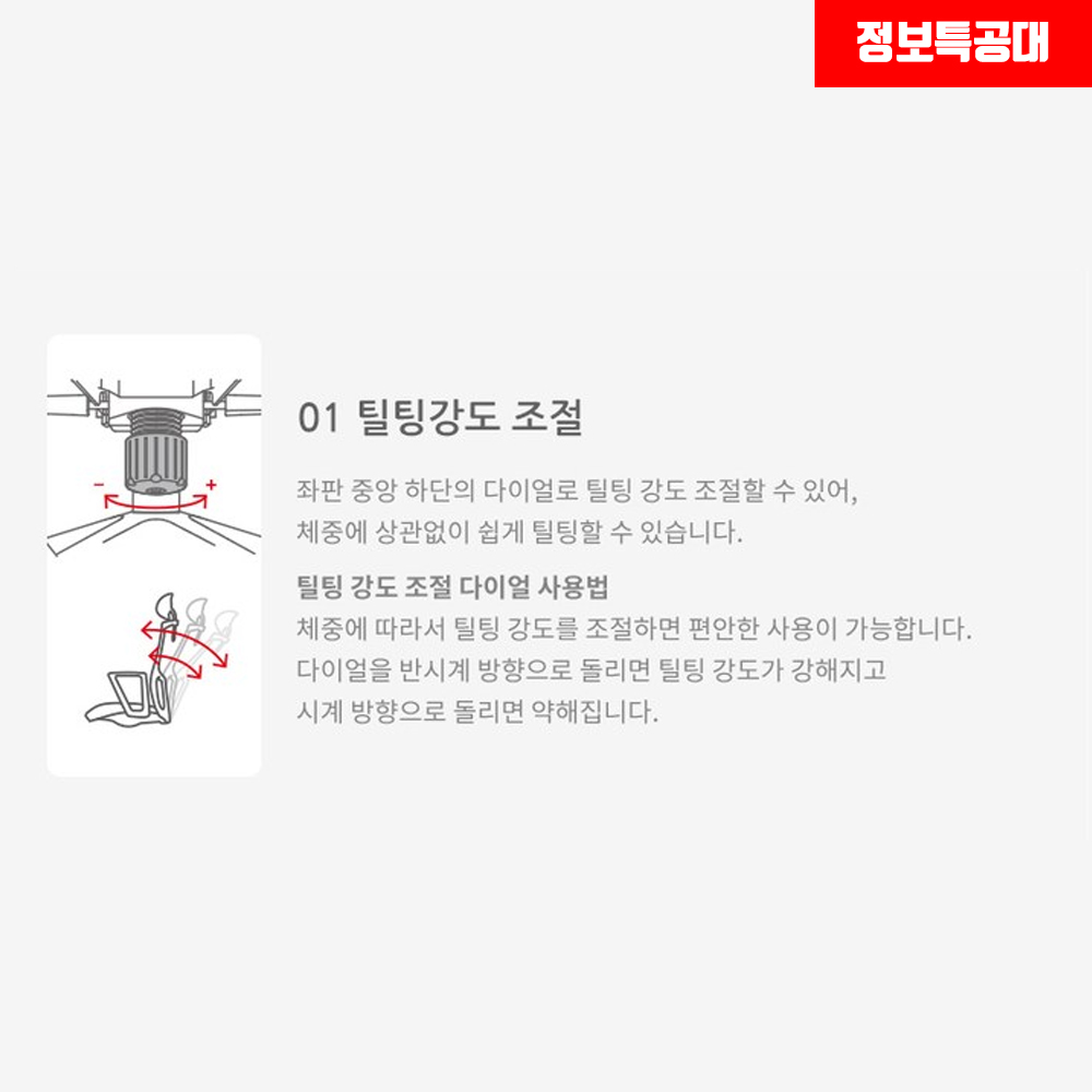좌판 중앙 하단의 다이얼로 틸팅 강도를 조절할 수 있어 체중에 상관없이 쉽게 틸팅할 수 있습니다. 다이얼을 반시계 방향으로 돌리면 강해지고, 시계 방향으로 돌리면 약해집니다.