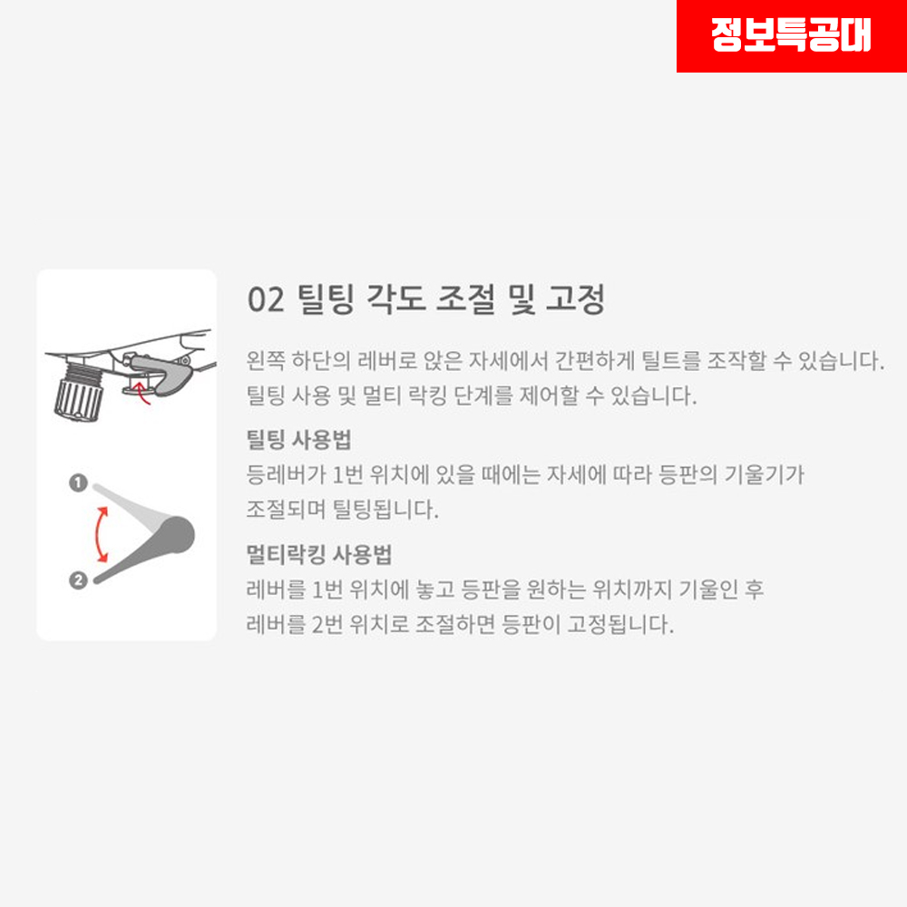 사용자가 편안한 각도로 등판을 고정시킬 수 있는 기능으로, 3단계로 설정이 가능합니다. 고정 후에는 일어날 때 등판이 따라오지 않습니다.