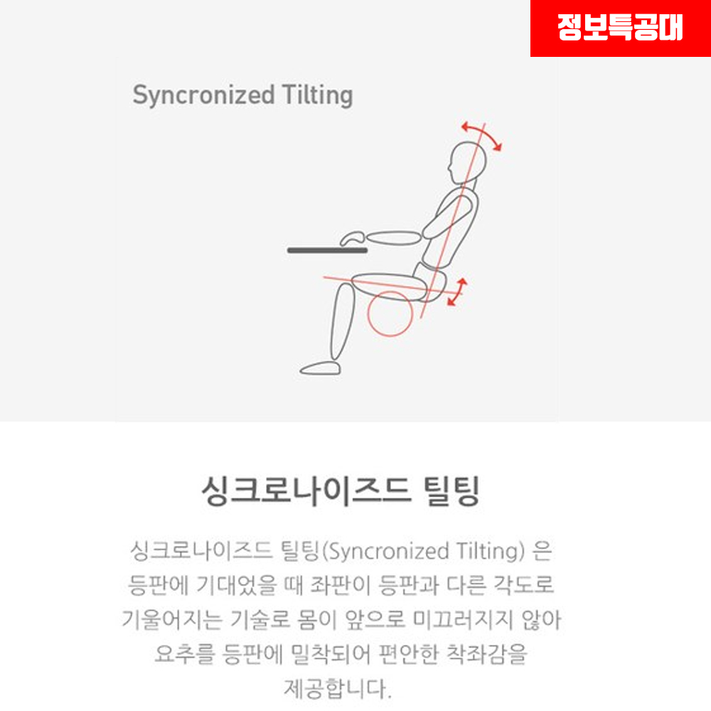 싱크로나이즈드 틸팅은 등판에 기대었을 때 좌판이 등판과 다른 각도로 기울어져 몸이 앞으로 미끄러지지 않게 해주며, 요추를 등판에 밀착시켜 편안한 착좌감을 제공합니다.