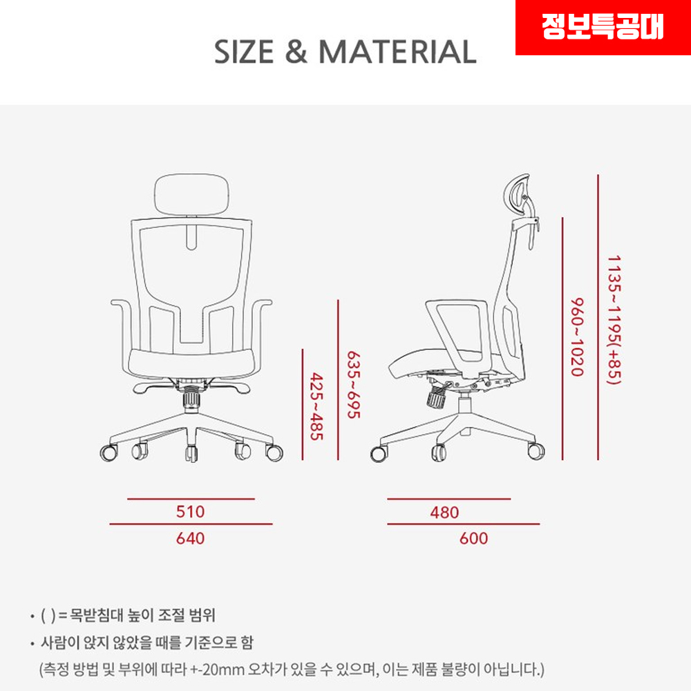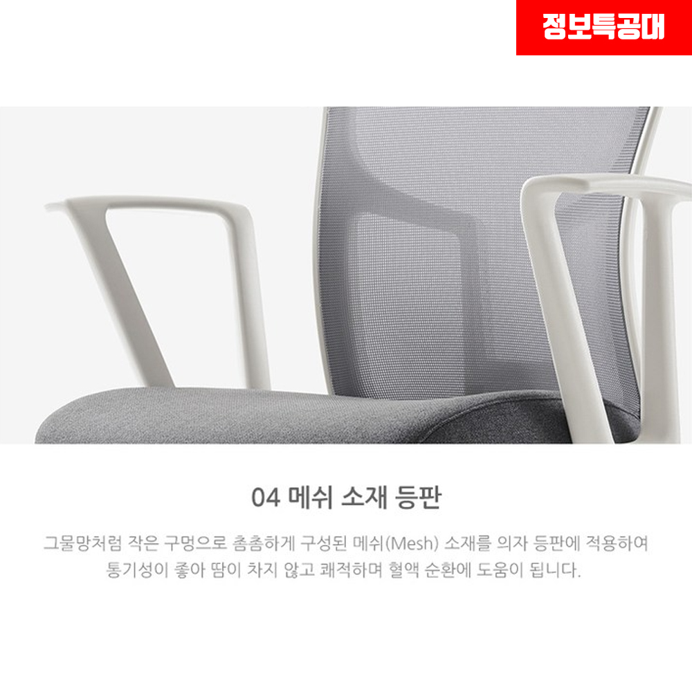 메쉬 소재의 등판은 통기성이 좋아 땀이 차지 않으며, 혈액 순환에 도움이 됩니다. 같은 조건에서 15분 동안 앉은 후 일어났을 때 온도 변화를 촬영한 결과, 메쉬 의자가 2℃ 정도 낮은 온도를 유지하는 것을 확인할 수 있습니다. 시원하고 쾌적한 착석감을 느껴보세요.
