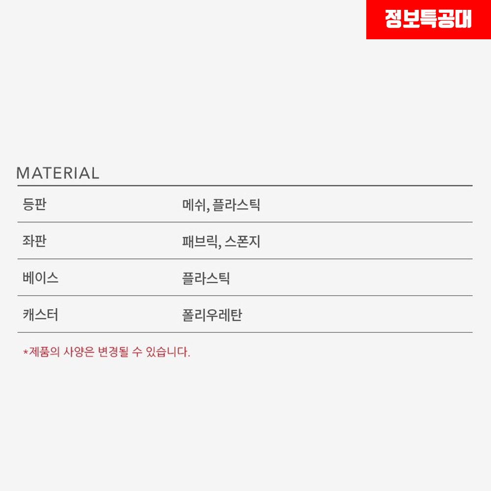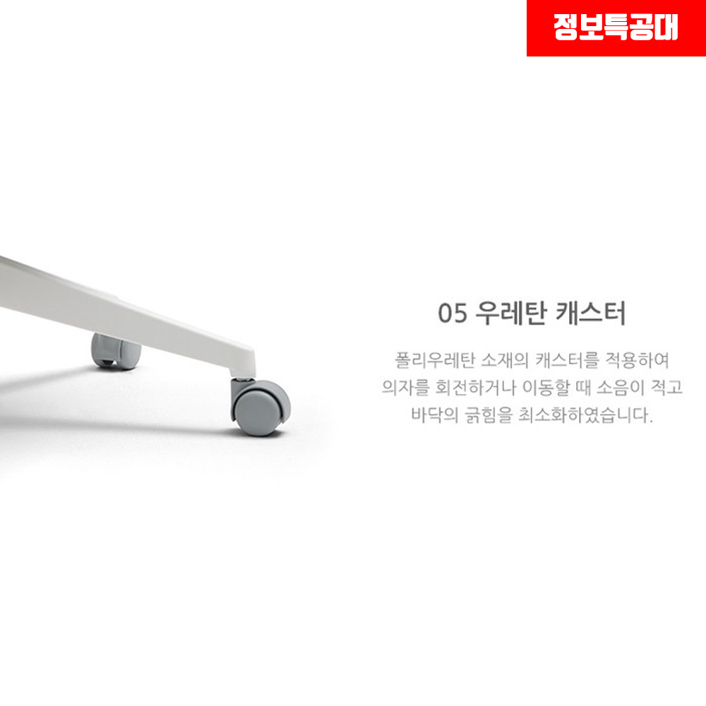폴리우레탄 소재의 캐스터를 적용하여 의자를 회전하거나 이동할 때 소음이 적고 바닥 긁힘을 최소화합니다.