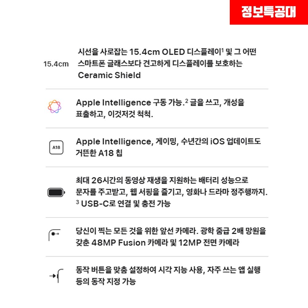 - 특징: 애플 인텔리전스, 액션 버튼, Face ID, IP68 방수 방진