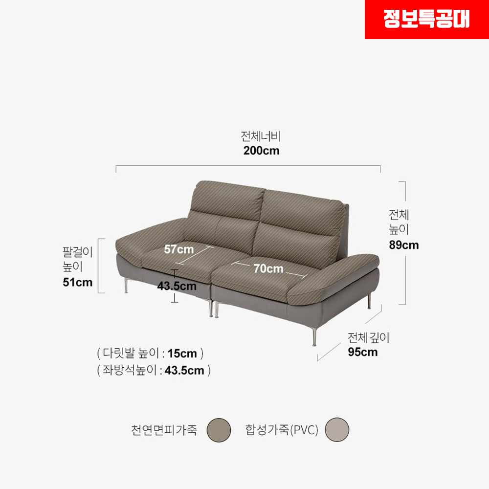 사이즈: 너비 200cm x 깊이 95cm x 높이 89cm (좌방석 높이: 43.5cm)