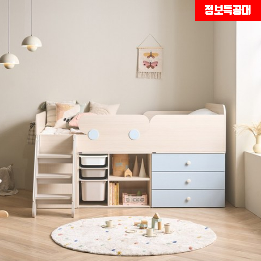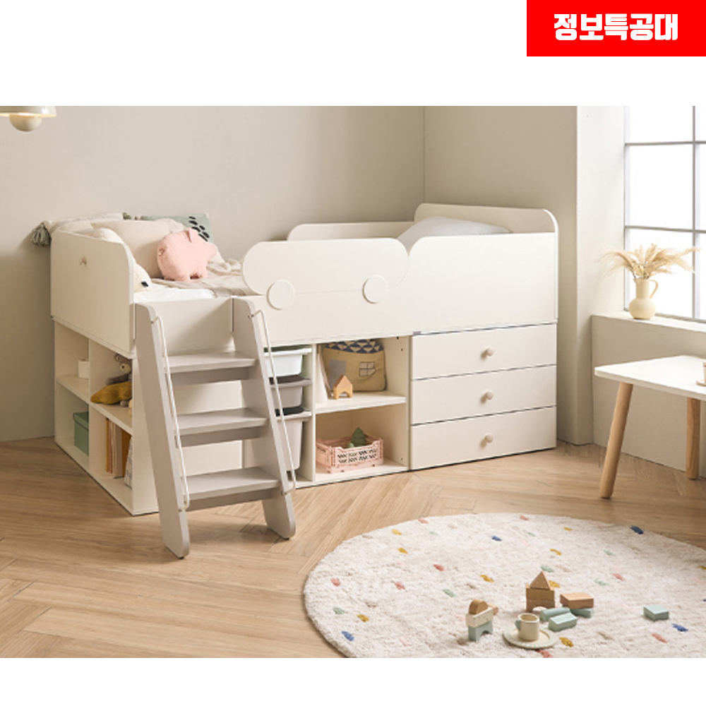 낮은 벙커침대는 선반장, 교구장, 서랍장 등 다양한 수납 공간을 제공하여 좁은 아이방에서도 효율적으로 활용할 수 있습니다. 아이들의 정리 습관을 길러주며, 가방걸이와 3단 서랍장을 통해 수납력을 극대화하였습니다.