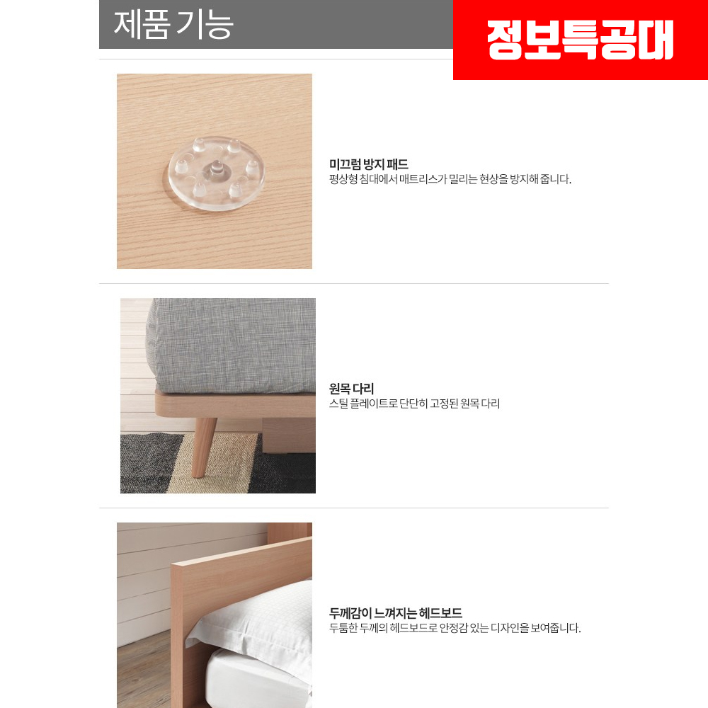 토스트 네츄럴 침대의 기능으로는 미끄럼 방지 패드가 있어서 침대에서 매트리스가 밀리는 현상을 방지해주며, 원목 다리로 단단히 고정되어 침대가 미끄러지지 않습니다.