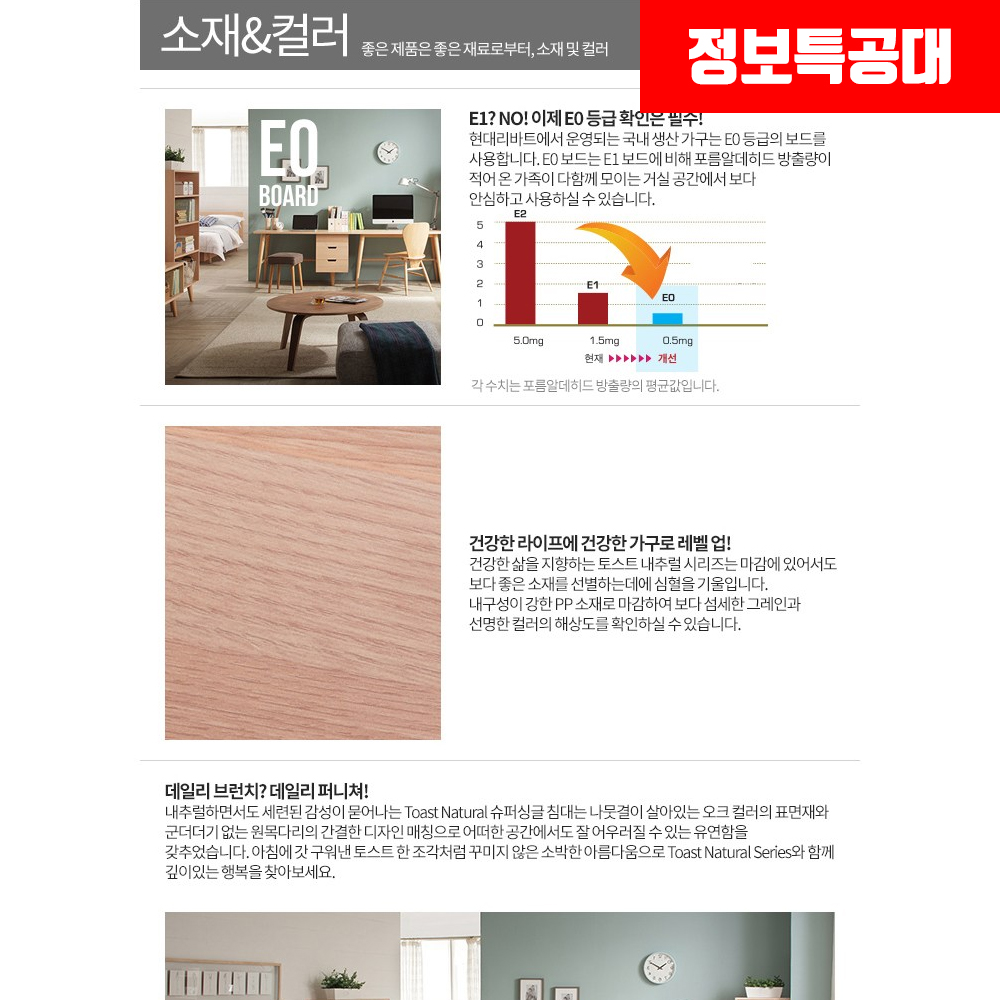 토스트 네츄럴 슈퍼싱글 침대는 E0 등급으로 포름알데히르 방출량이 적어서 믿을 수 있습니다.