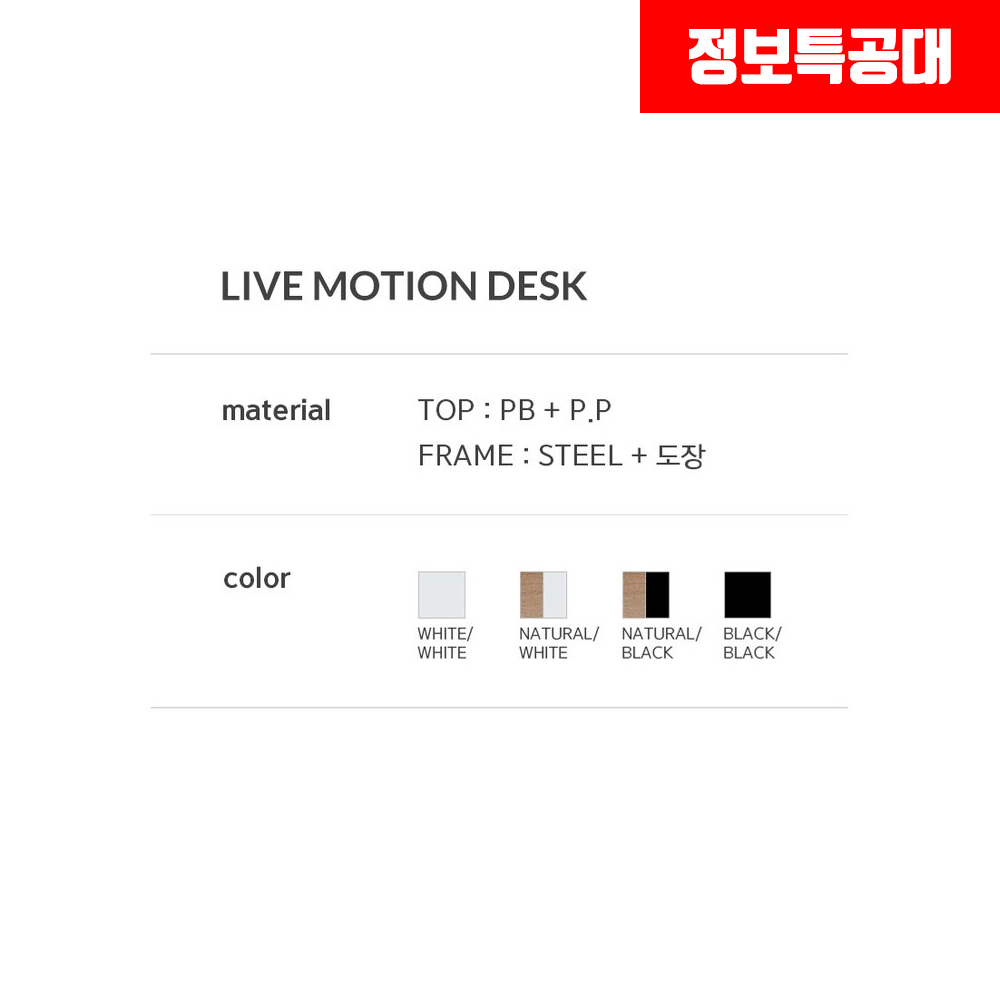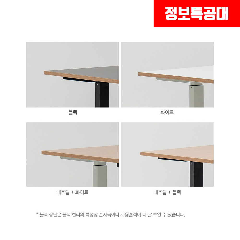 모션 데스크 추천 상품의 컬러는 위의 이미지를 참고해주시면 구입에 더욱 큰 도움이 될 수 있으며, 블랙 컬러 상판은 컬러 특성상 손자국이 더 잘 보일 수 있습니다.