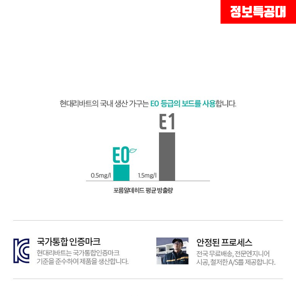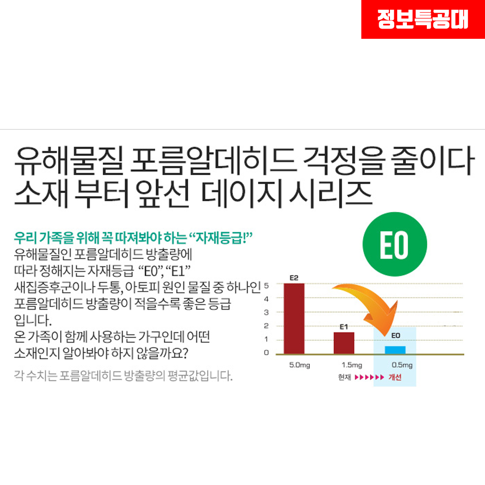 E0 등급의 소재를 사용해서 방출량이 현저히 줄어들어 개선되었으며, 타사의 제품과 차이를 두는 제품이라고 볼 수 있어요.