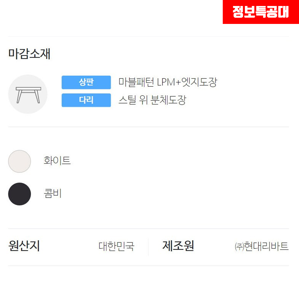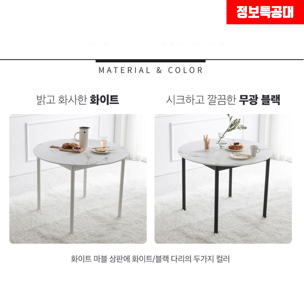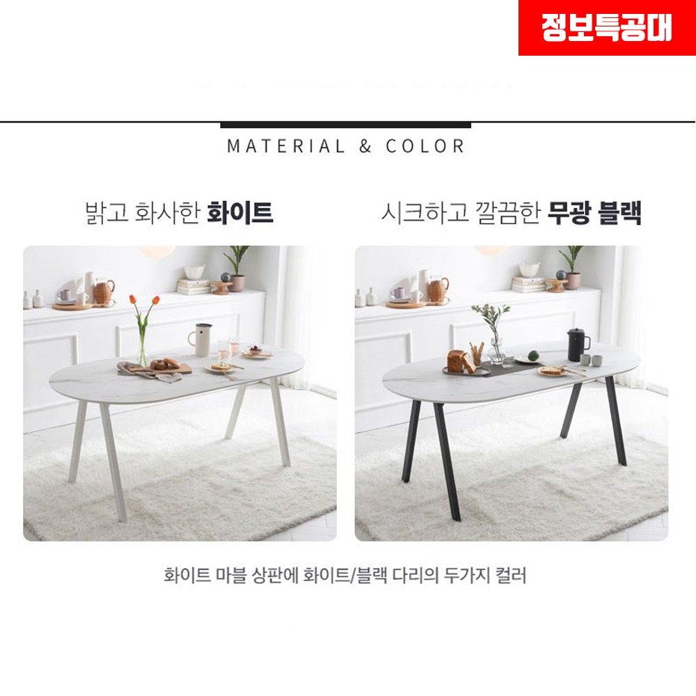 리바트 로티르 식탁의 컬러는 다리에 포인트 컬러가 들어가는데 화이트는 말 그대로 밝고 화사한 화이트 컬러가 적용되었고 콤비는 무광 블랙 컬러라고 보시면 이해하기 더욱 쉽습니다.