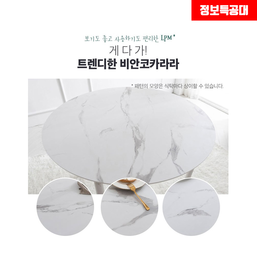 리바트 로티르 식탁 상판에 적용된 LPM이라는 소재는 종이에 다양한 모양을 인쇄해 프레스로 접착한 소재이며, 관리하기 매우 편리한데요.