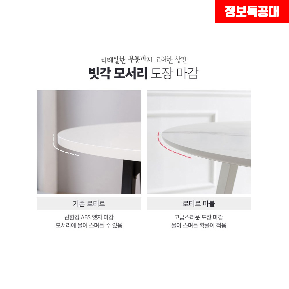 리바트 로티르 식탁의 라운드 도장 마감은 구사양에서 신사양으로 바뀌었는데 친환경 ABS 엣지 마감을 이용해습니다.