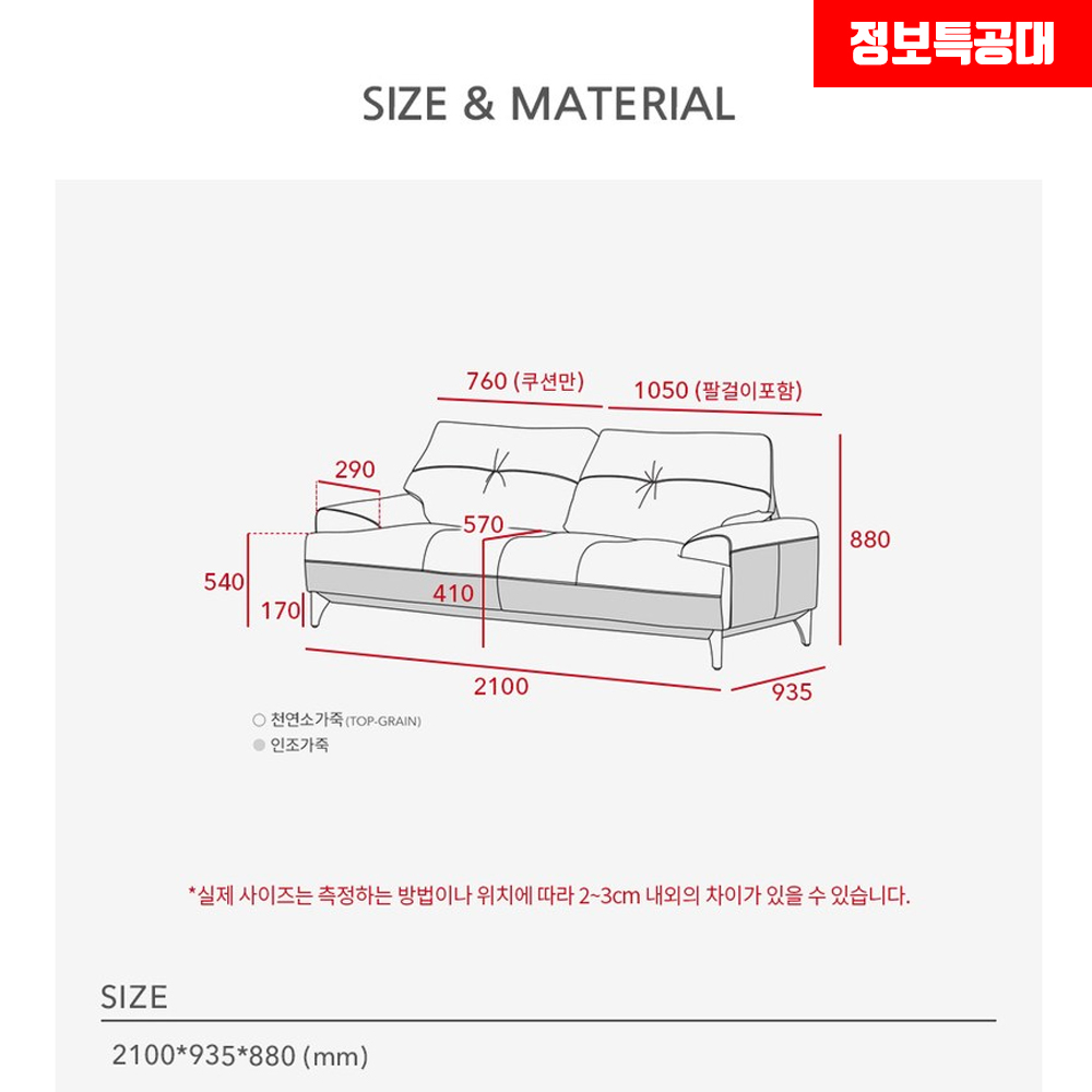일룸 보스턴 소파 3인 사이즈 - 가로 2100mm, 깊이 935mm, 세로 880mm입니다.