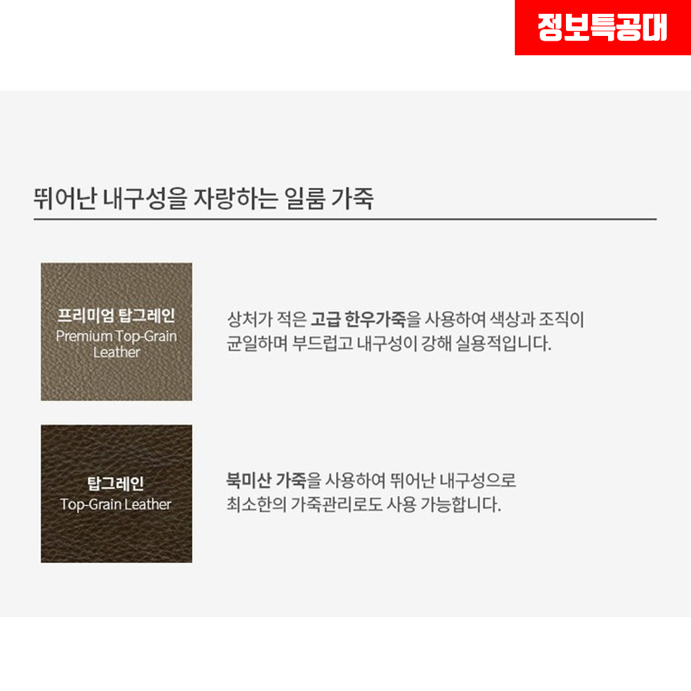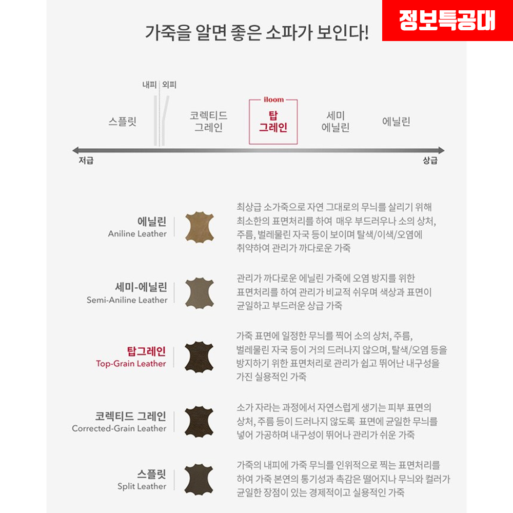 가죽은 중간 단계의 탑 그레인이 적용되어 있으며, 탑 그레인은 가죽 표면에 일정한 무늬를 찍어 소의 상처, 주름, 벌레 물린 자국 등이 거의 보이지 않아 탈색이나 오염 등을 방지하기 위해 표면처리를 해서 관리가 쉽고 뛰어난 내구성을 가진 가죽이 일룸 보스턴 소파에 적용되었습니다.