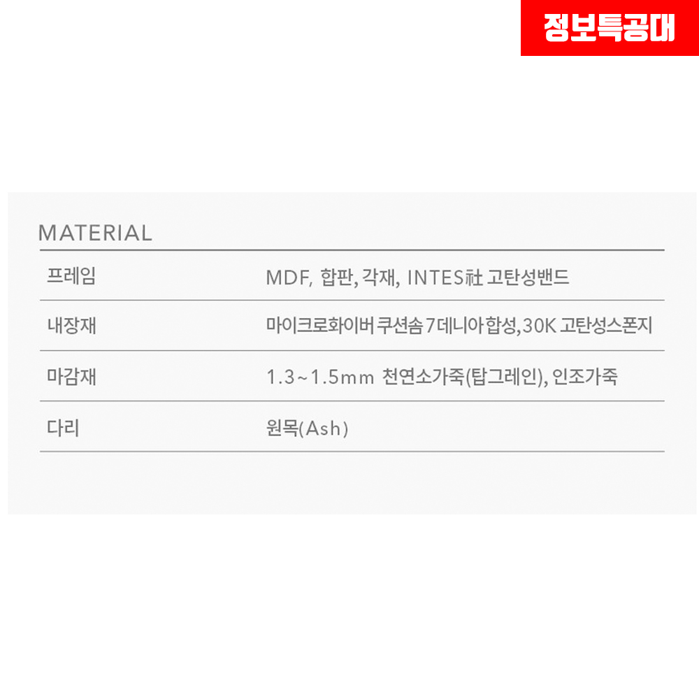 일룸 보스턴 소파의 마감재는 1.3~1.5mm의 천연 소가죽(탑 그레인 등급)이 들어가고 인조가죽이 들어갔으며, 다리는 원목이 적용되었습니다.