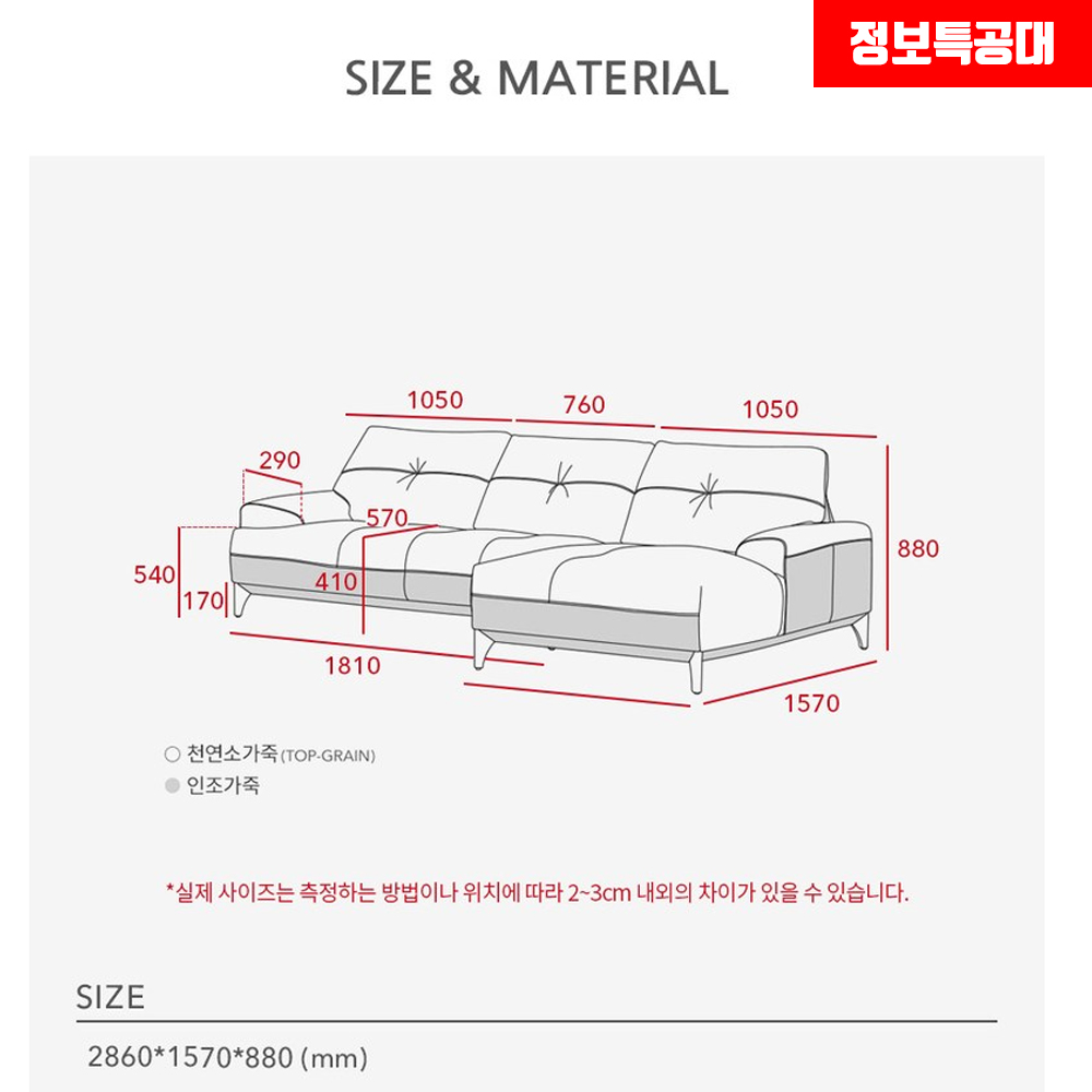 일룸 보스턴 소파 카우치 사이즈 - 가로 2860mm 깊이 1570mm 높이 880mm입니다.