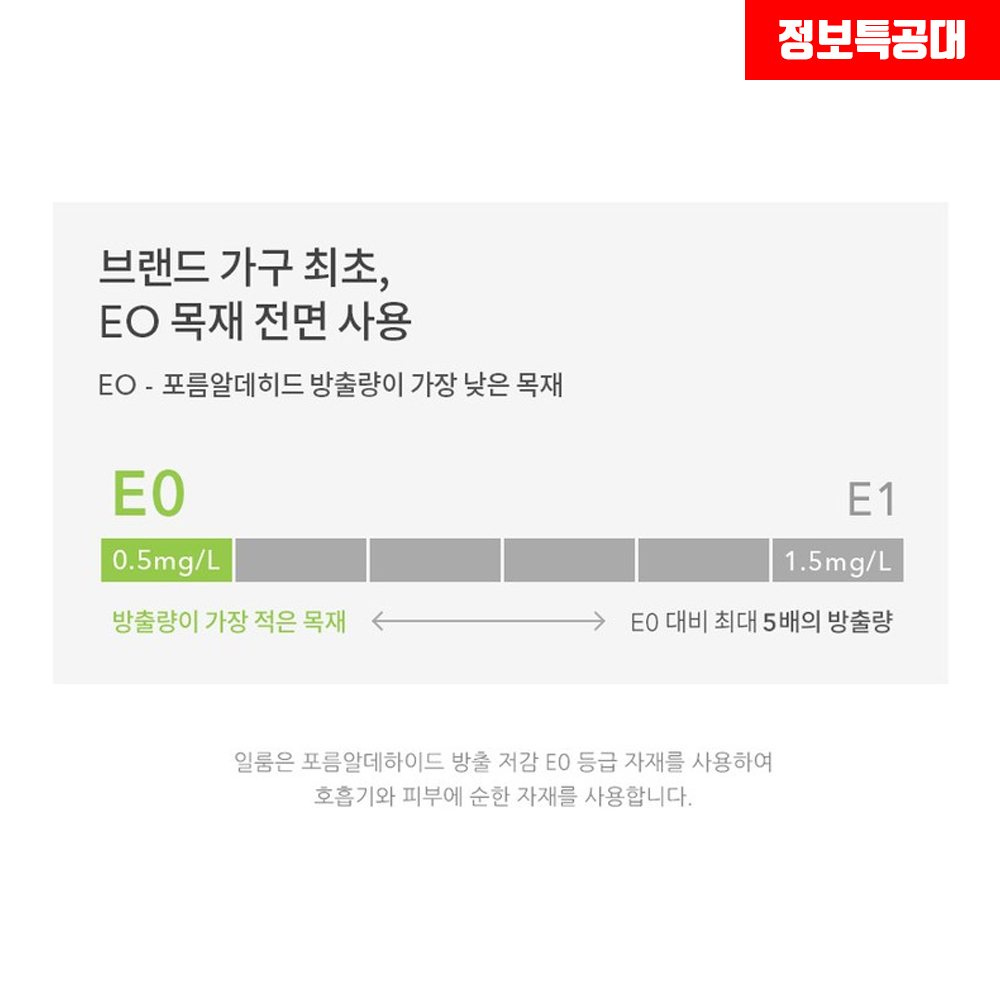 우선 일룸 팅클팝 침대를 포함해 모든 가구들은 E0등급의 목재를 사용해 제조하기에 인체에 유해한 포름알데하이드 방출량이 약 0.5mg/L 미만으로 방출됩니다.