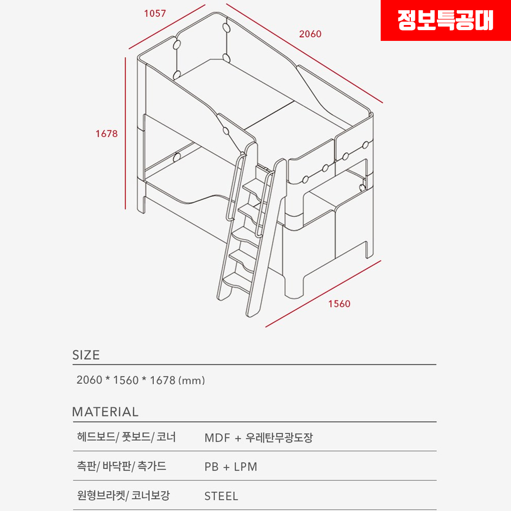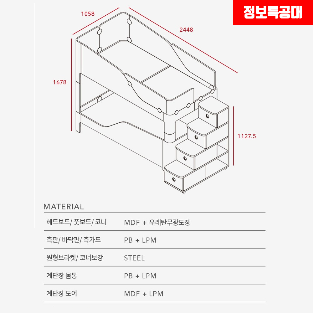 일룸 팅클팝 침대 계단장형의 소재는 헤드보드, 풋보드, 코너, 측판, 바닥, 측가드, 원형브라켓, 코너보강은 계단, 1인 침대와 동일한 소재가 적용되었습니다.