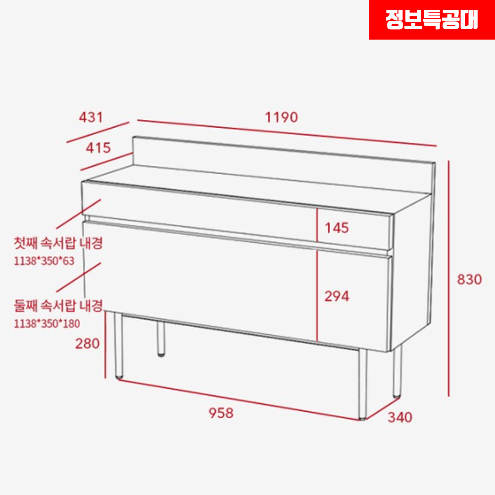 일룸 화장대 몸통은 가로 1190mm, 깊이 431mm, 높이 830mm로 출시되었습니다.