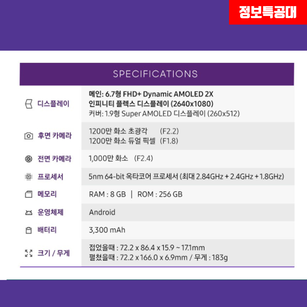 위의 이미지는 갤럭시 Z 플립3 자급제의 스펙이고 참조해서 구매하시면 더욱 도움이 될 수 있습니다.