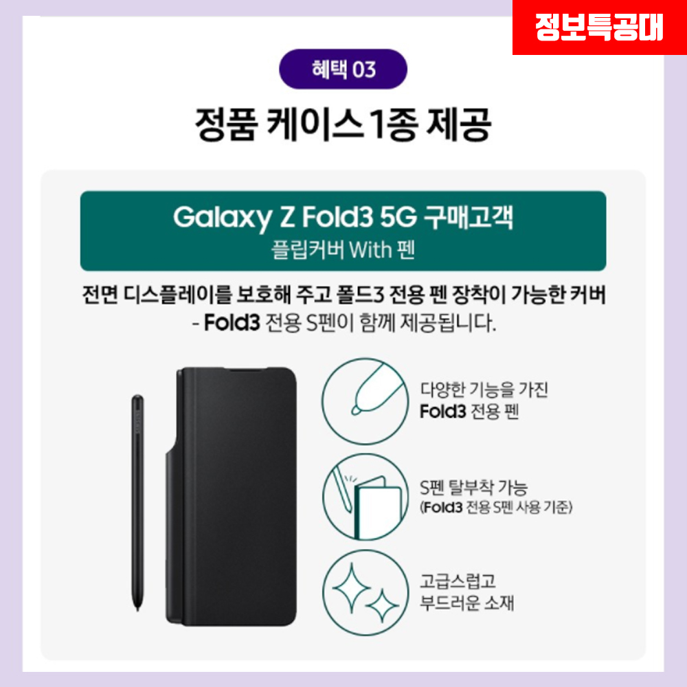 갤럭시 Z 플립3 자급제를 사전 구매하는 분들에게 정품 케이스 1종을 제공하며, 다양한 기능과 S펜이 제공되기 때문에 사전 구매를 놓치면 정말 아쉬운 혜택이에요.