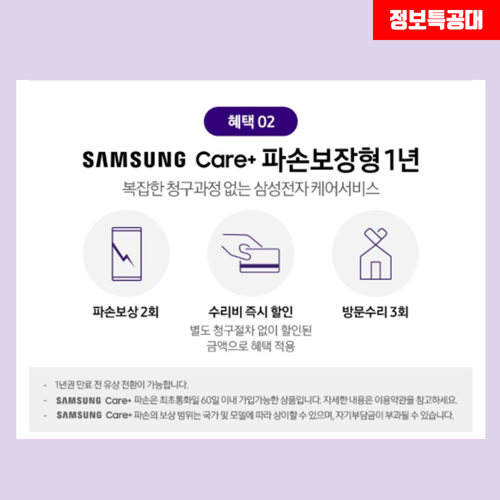 갤럭시 Z 플립3 자급제의 A/S는 삼성 케어 플러스로 파손보장 1년이 지원되고 2회까지 지원을 받을 수 있습니다.