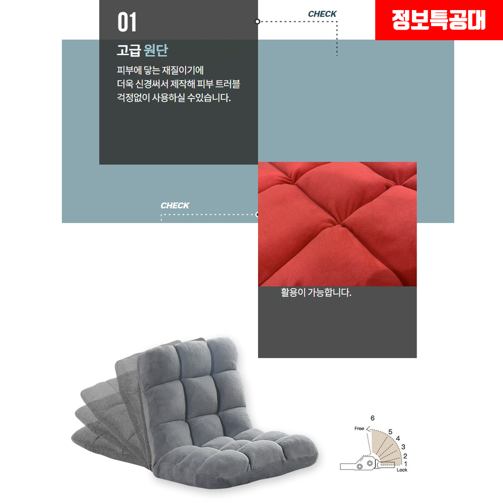 심지어 1인 리클라이너 좌식 소파의 리클라이너 기능은 6단계까지 각도 조절이 가능해 다양한 각도로 사용이 가능해 편리하게 이용할 수 있습니다.
