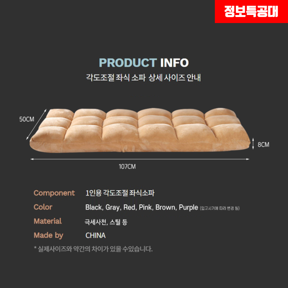 1인 리클라이너 좌식 소파의 사이즈는 가로 50cm, 세로 107cm, 높이 8cm로 얇지 않고 푹신하게 사용할 수 있는 제품입니다.