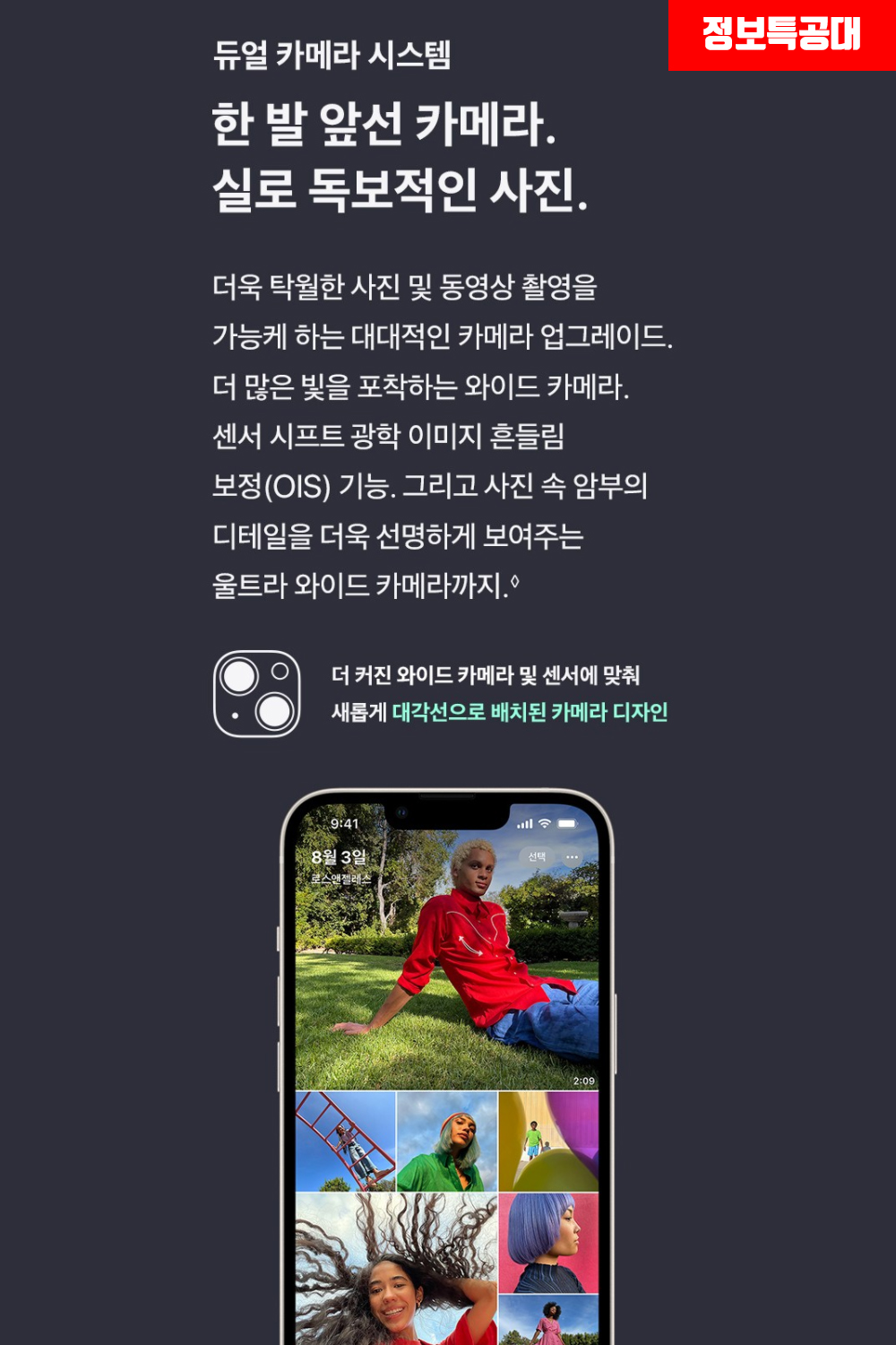 아이폰 13은 듀얼 카메라 시스템으로 대대적인 카메라 업그레이드를 진행해 더 많은 빛을 포착하는 와이드 카메라를 경험할 수 있고 센서 시프트 광학 이미지 흔들림 보정(OIS) 기능 그리고 사진 속 암부의 디테일을 더욱 선명하게 보여주는 울트라 와이드 카메라까지 모두 경험할 수 있어서 매력적인 사진과 영상 촬영할 수 있습니다.