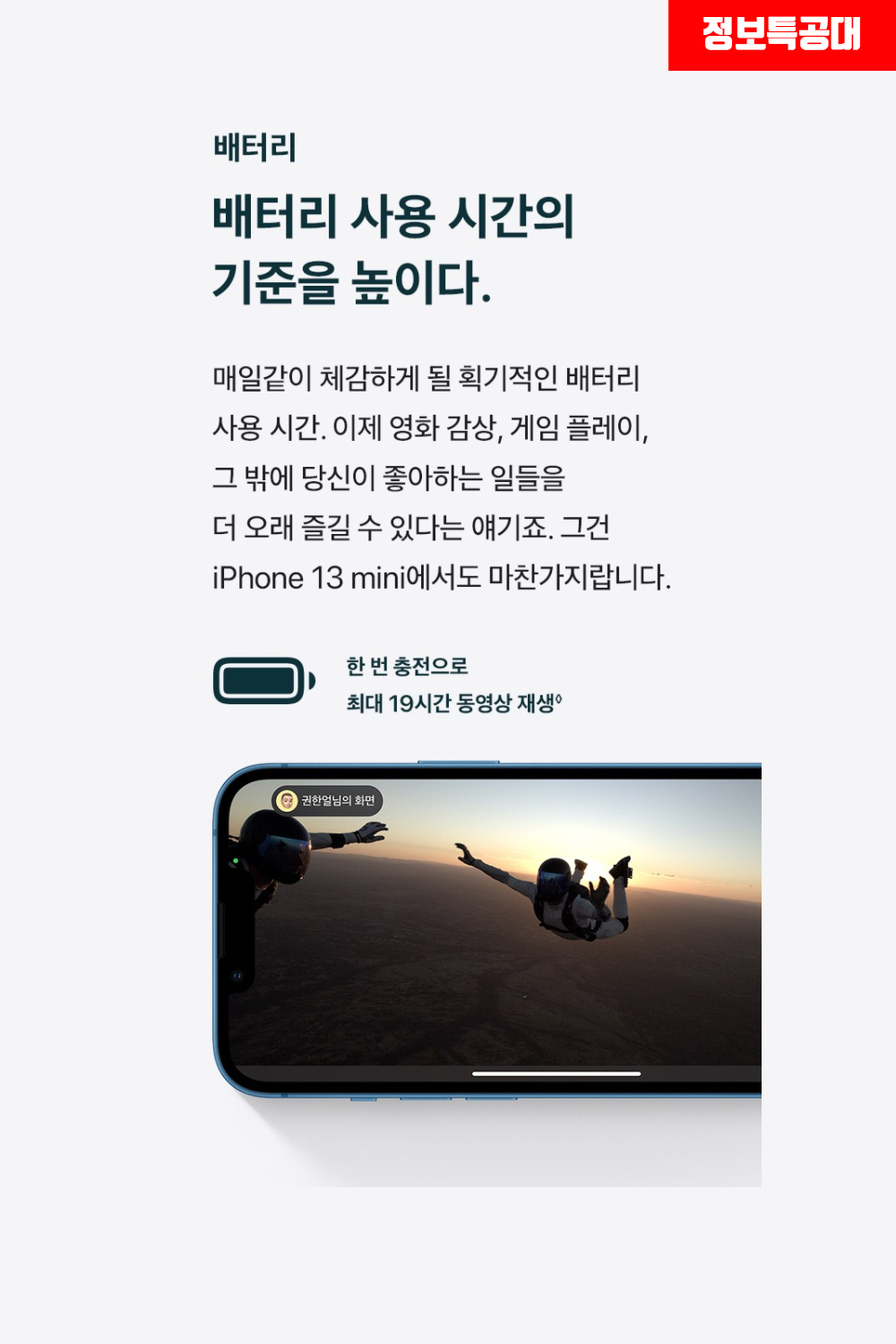 다음으로 아이폰13 자급제 사전예약을 해야하는 이유는 배터리 사용 시간이 높아져 한 번 충전으로 최대 19시간 동영상 재생이 가능합니다.