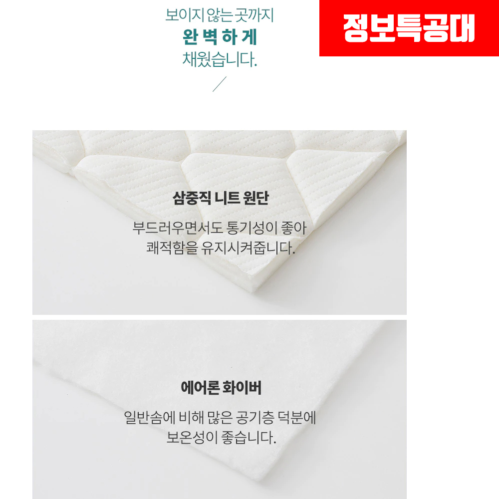 삼중직 니트 원단은 부드럽고 통기성이 좋아서 매트리스에 많이 사용되는 원단이며, 에어론 화이버는 일반 솜보다 단가가 높지만 보온성이 좋아서 프리미엄과 스텐다드 중간인 매트리스에 많이 이용되는 원단입니다.
