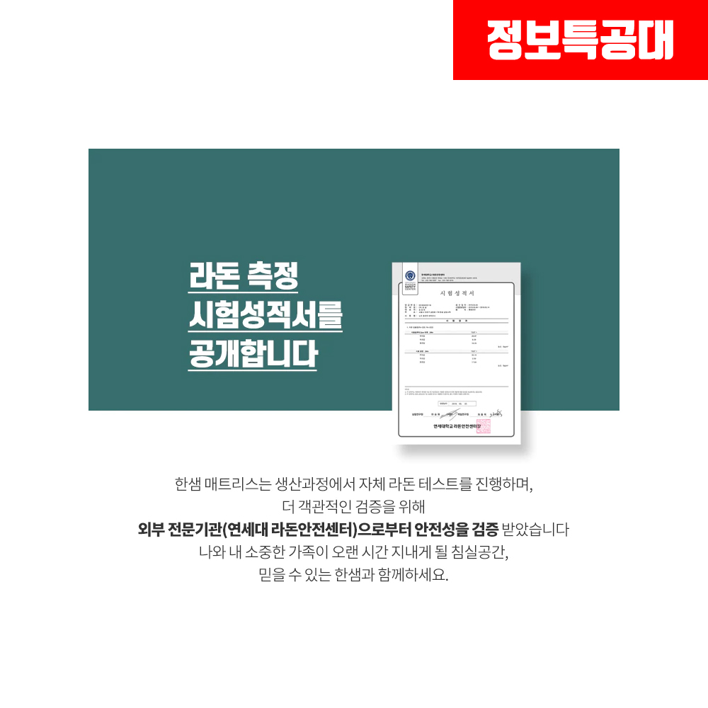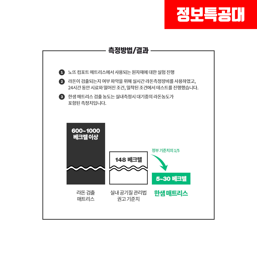 안전성을 검사받으며, 통과한 검증된 매트리스라서 일반 매트리스에 비해 라돈이 5~30 베크렐이라는 미량만 나왔다는 것이 믿고 구매할 수 있다는 큰 장점입니다.