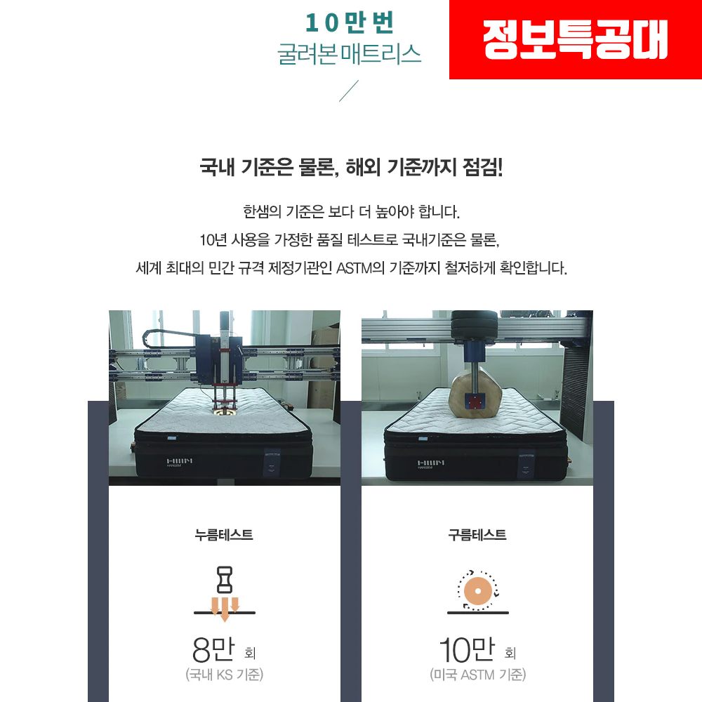 또한 누름테스트 8만 회와 구름테스트 10만 회를 통해 약 10년간 사용이 가능한 가성비의 끝판왕 매트리스입니다.