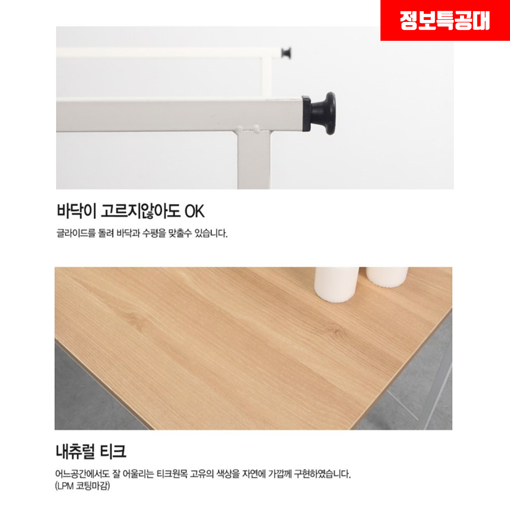 컴퓨터 책상 1400의 소재는 티크 판넬과 블랙 프레임 or 화이트 프레임을 사용하고 PB(LPM 표면마감), 철제를 사용해 제조되었습니다.