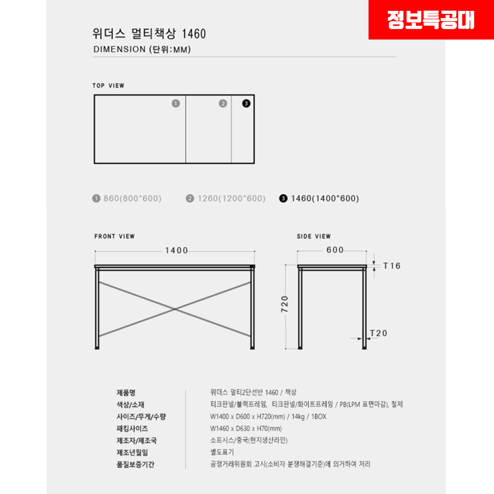 컴퓨터 책상 1400 사이즈는 가로 1400mm 깊이 600mm 높이 720mm이며, 무게는 약 14kg입니다. 패킹 사이즈까지 포함한다면 가로 1460mm 깊이 630mm입니다.