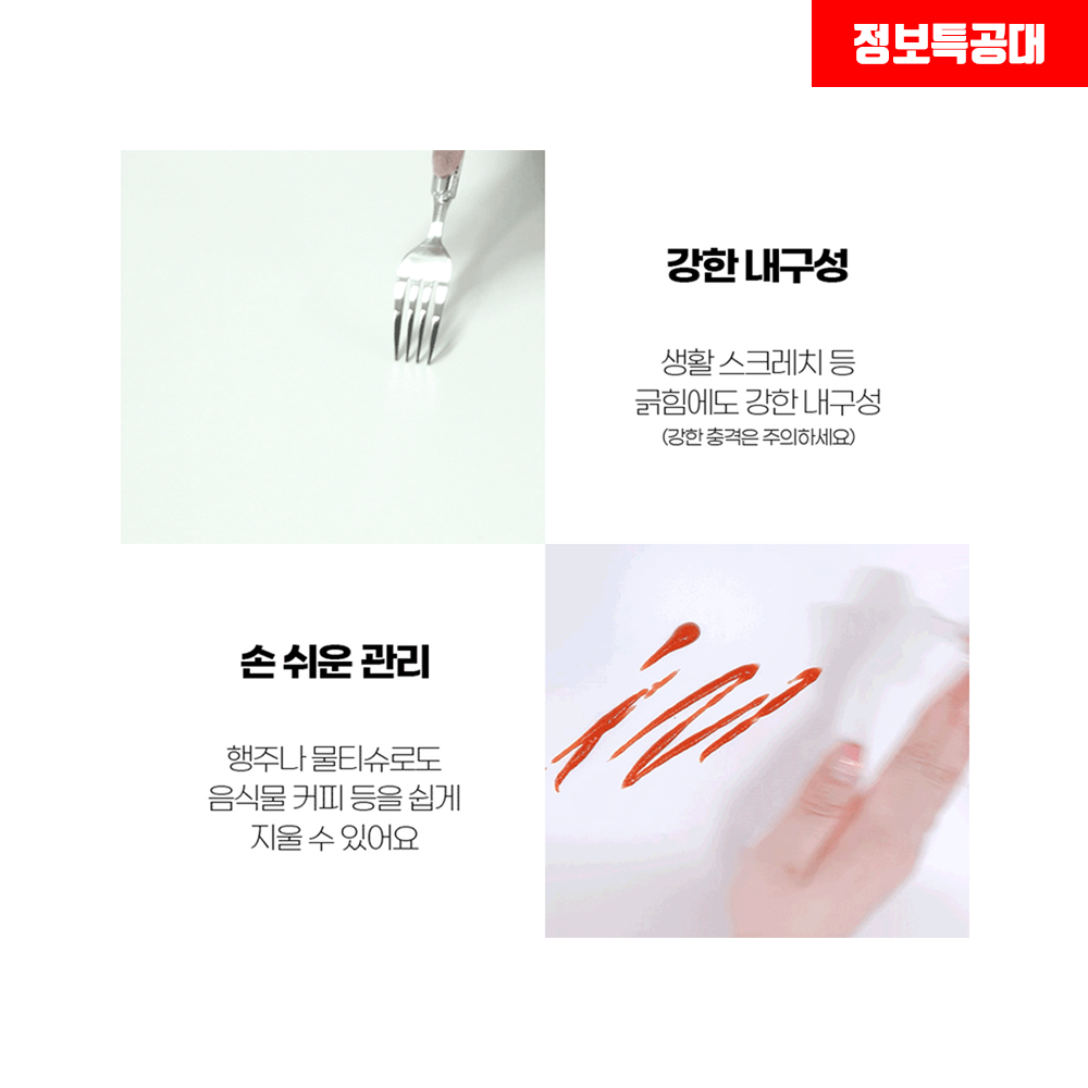 화이트 컬러의 라미네이트 상판은 무독성 소재로 내구성과 내수성이 우수해 스크레치에 강하고 관리가 수월해 오랫동안 새 것처럼 사용이 가능하다는 장점이 있습니다. (너무 강한 충격은 주의해주세요.) 추가로 손 쉬운 관리가 가능해 행주나 물티슈로도 음식물 커피 등을 쉽게 지울 수 있습니다.