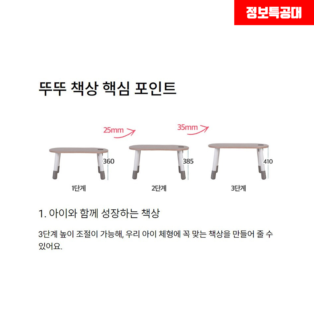 리바트 뚜뚜책상은 아이와 함께 성장하는 책상으로 3단계 높이 조절이 가능해, 우리 아이 체형에 꼭 맞는 책상을 만들어 줄 수 있습니다.