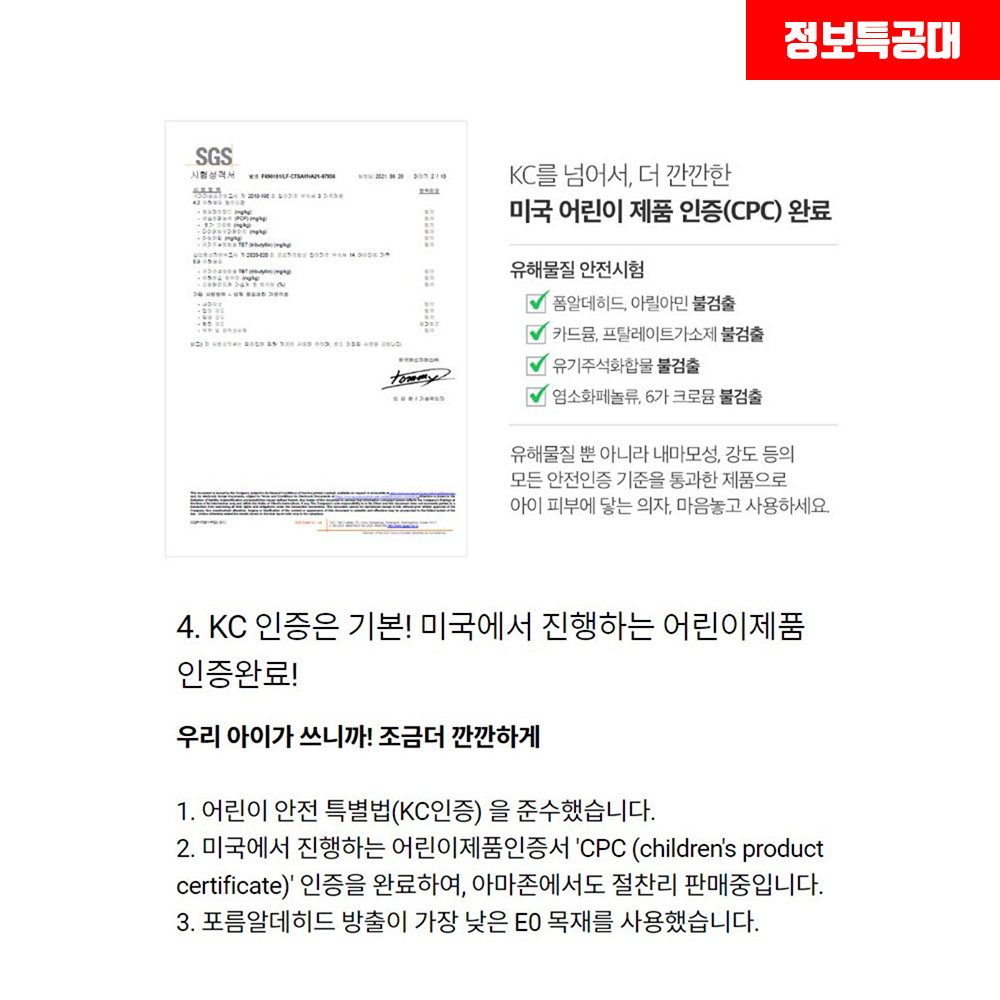 리바트 뚜뚜책상은 아이들이 사용하는 제품이다보니 어린이 안전 특별법 KC인증을 준수했으며, 미국에서 진행하는 어린이제품인증서 CPC(Children's product certificate) 인증을 완료하여, 아마존에서도 절찬리 판매중에 있습니다.
