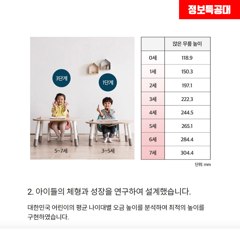 0세부터 7세까지 앉은 무릎 높이를 기준으로 연구해 높이를 측정했는데요. 아래 연령대별 높이 표를 확인해보시면 좀 더 쉽게 이해할 수 있습니다.