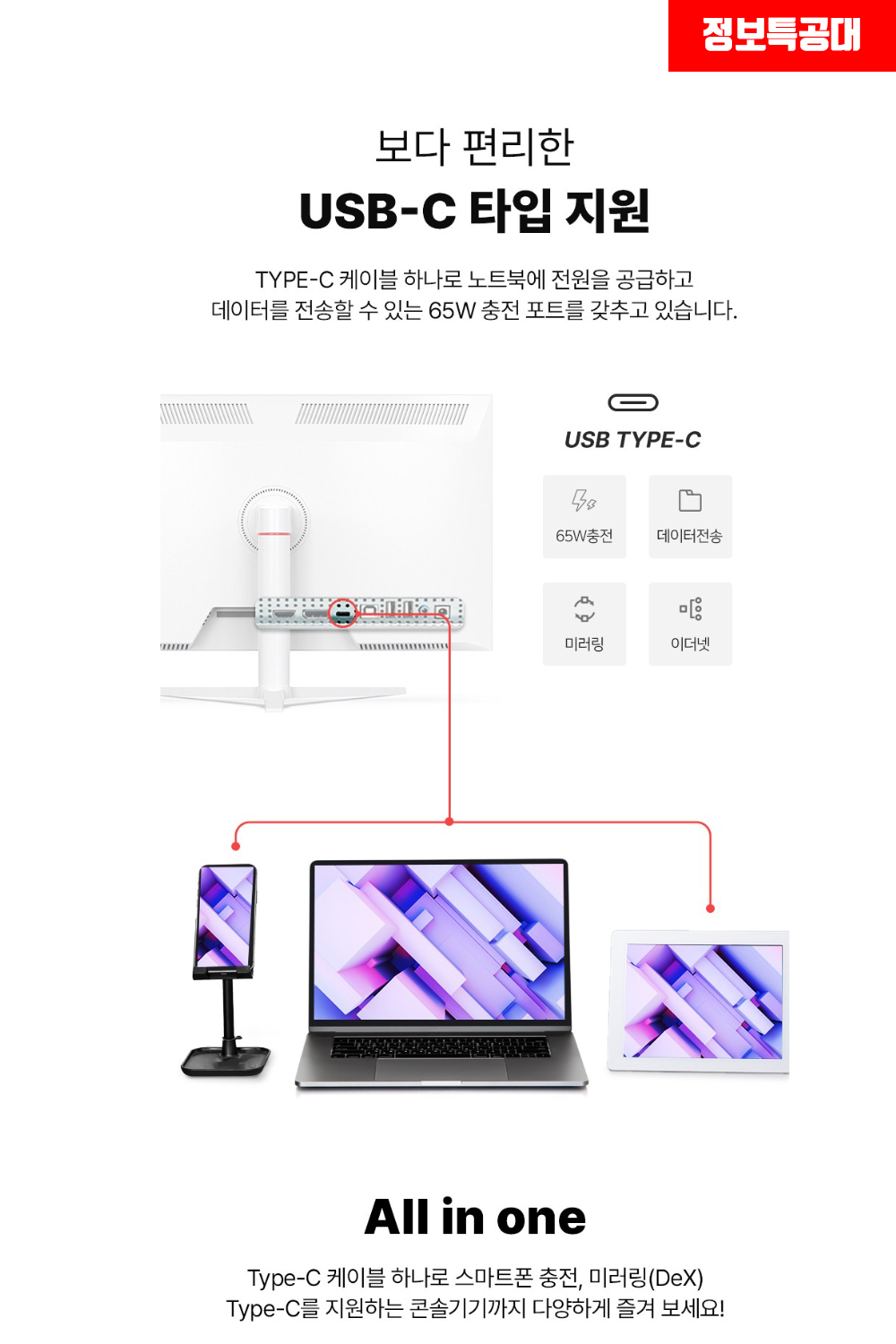 이 모니터는 USB Type C 포트를 지원하여 다양한 디바이스와의 연결이 매우 간편합니다. 단 하나의 케이블로 노트북, 태블릿, 스마트폰 등을 연결할 수 있으며, 65W의 출력으로 충전도 동시에 가능합니다. 이는 특히 책상 위 공간을 절약하고, 복잡한 케이블 관리에서 해방될 수 있게 해줍니다.