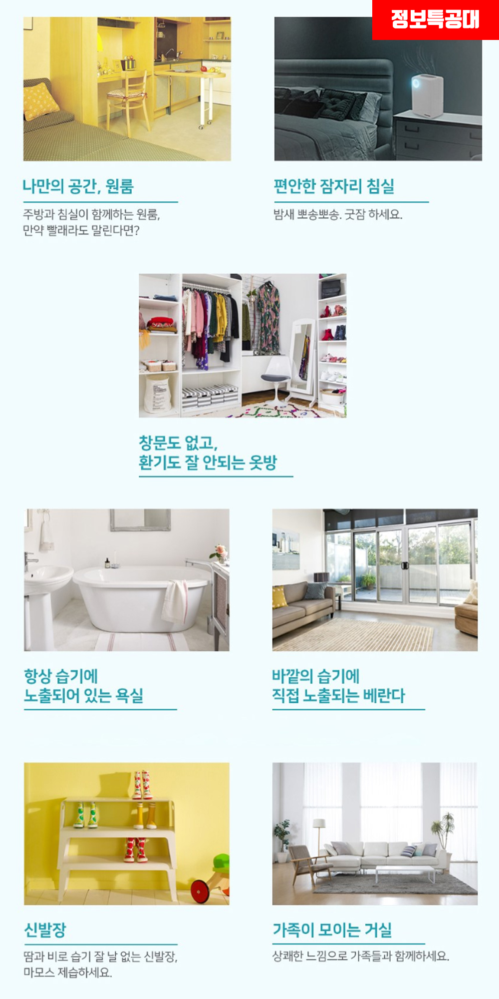 ① 침실: 밤새 습기를 제거하여 쾌적한 수면 환경을 조성합니다.