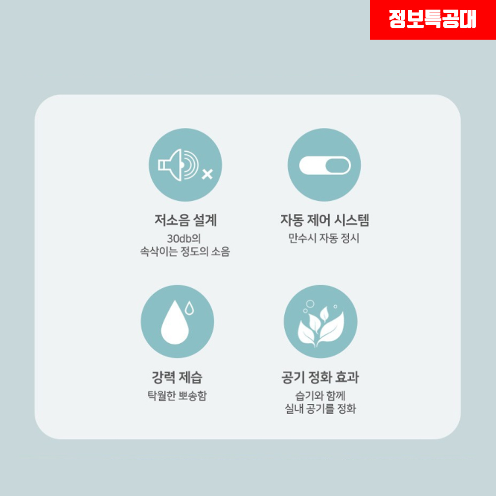 ④ 자동 종료 기능: 물탱크가 가득 차면 자동으로 전원이 꺼지는 기능이 있어 안전하고 편리하게 사용할 수 있습니다.