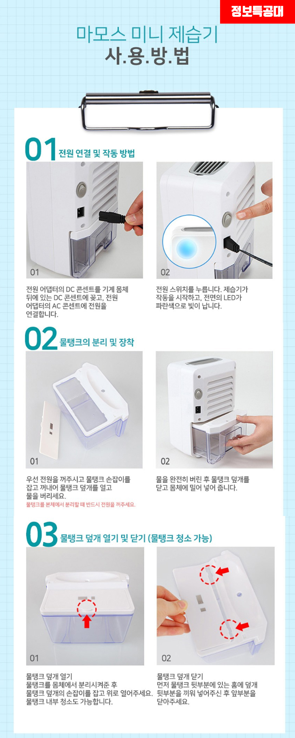 ① 용량과 디자인: 마모스 미니 제습기는 250ml 용량의 수분을 제거할 수 있으며, 콤팩트한 사이즈로 어떤 공간에서도 부담 없이 사용할 수 있습니다. 깔끔하고 모던한 디자인으로 실내 인테리어와도 잘 어울립니다.