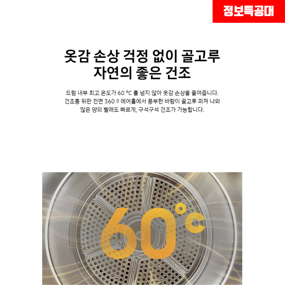 · 드럼 내부 최고 온도가 60℃를 넘지 않아 옷감 손상을 최소화합니다.