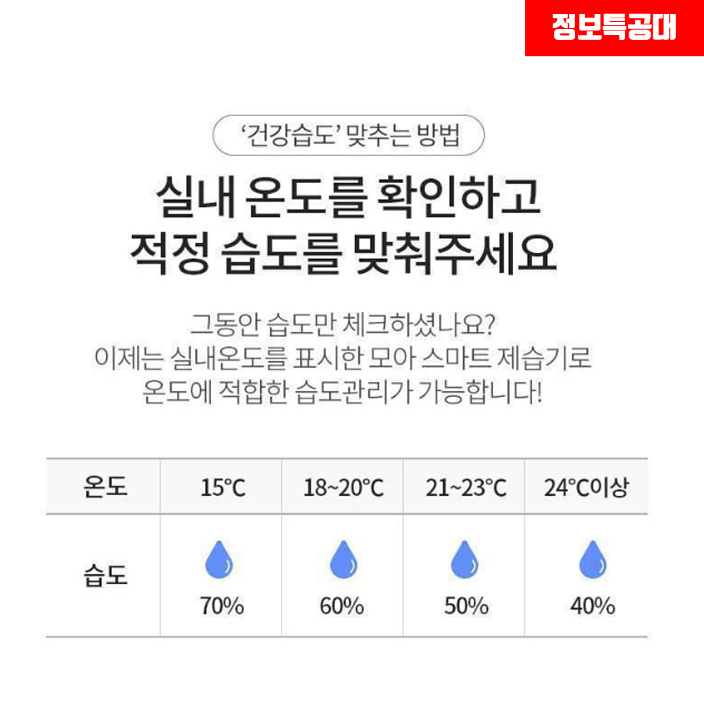 실내 온도를 확인하고 적정 습도를 맞추세요. 보아르 모아 스마트 제습기는 실내 온도를 표시하여 온도에 맞는 습도 관리를 가능하게 합니다.